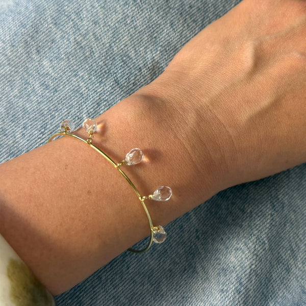 A sleek and versatile cuff bangle designed to fit comfortably on any wrist.  The open, adjustable design allows you to gently squeeze the ends for a perfect fit, while two shimmering white topaz drops add just the right touch of sparkle.  Wear it solo for understated elegance or stack with your favorite bracelets for a chic layered look.